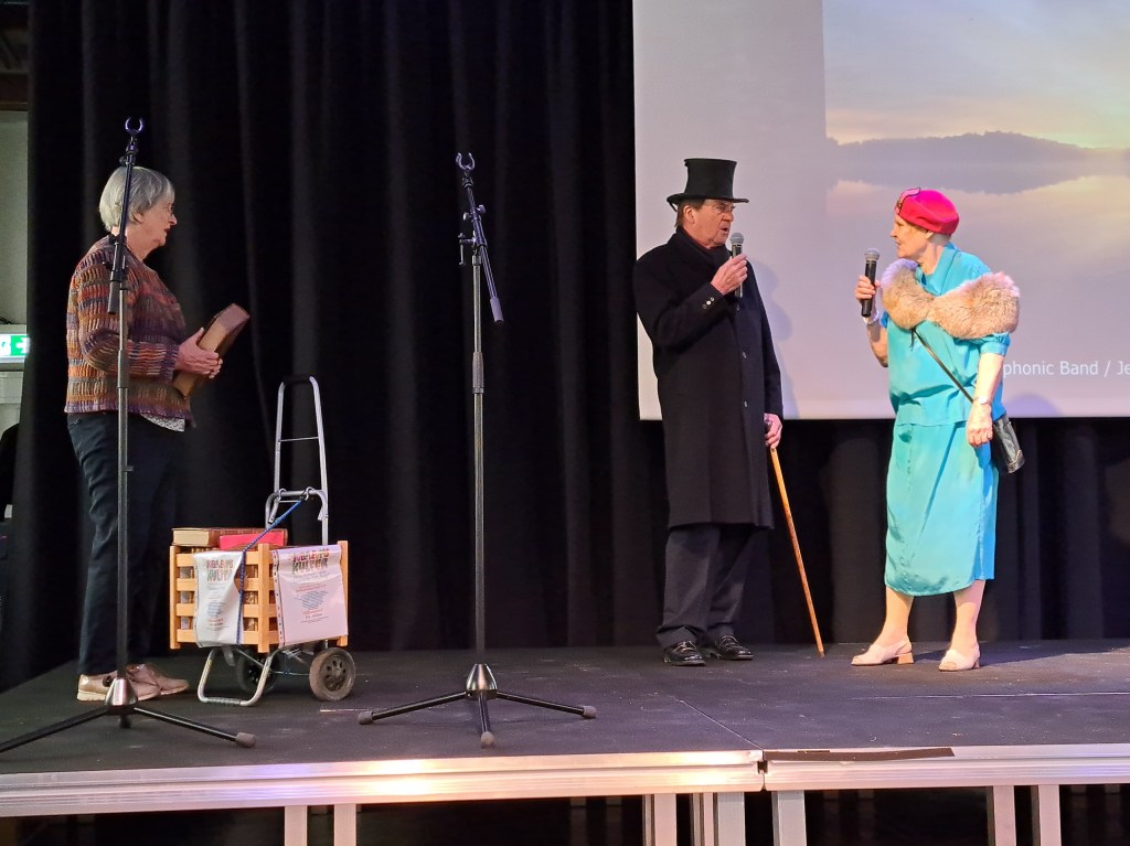 Inför en tur med ångbåts- Färjan 4 som delar av publiken skulle följa med på presenterade Thore Hagman med hjälp av sin dotter utrustning för sjöräddningen vid starten 1907 och nu